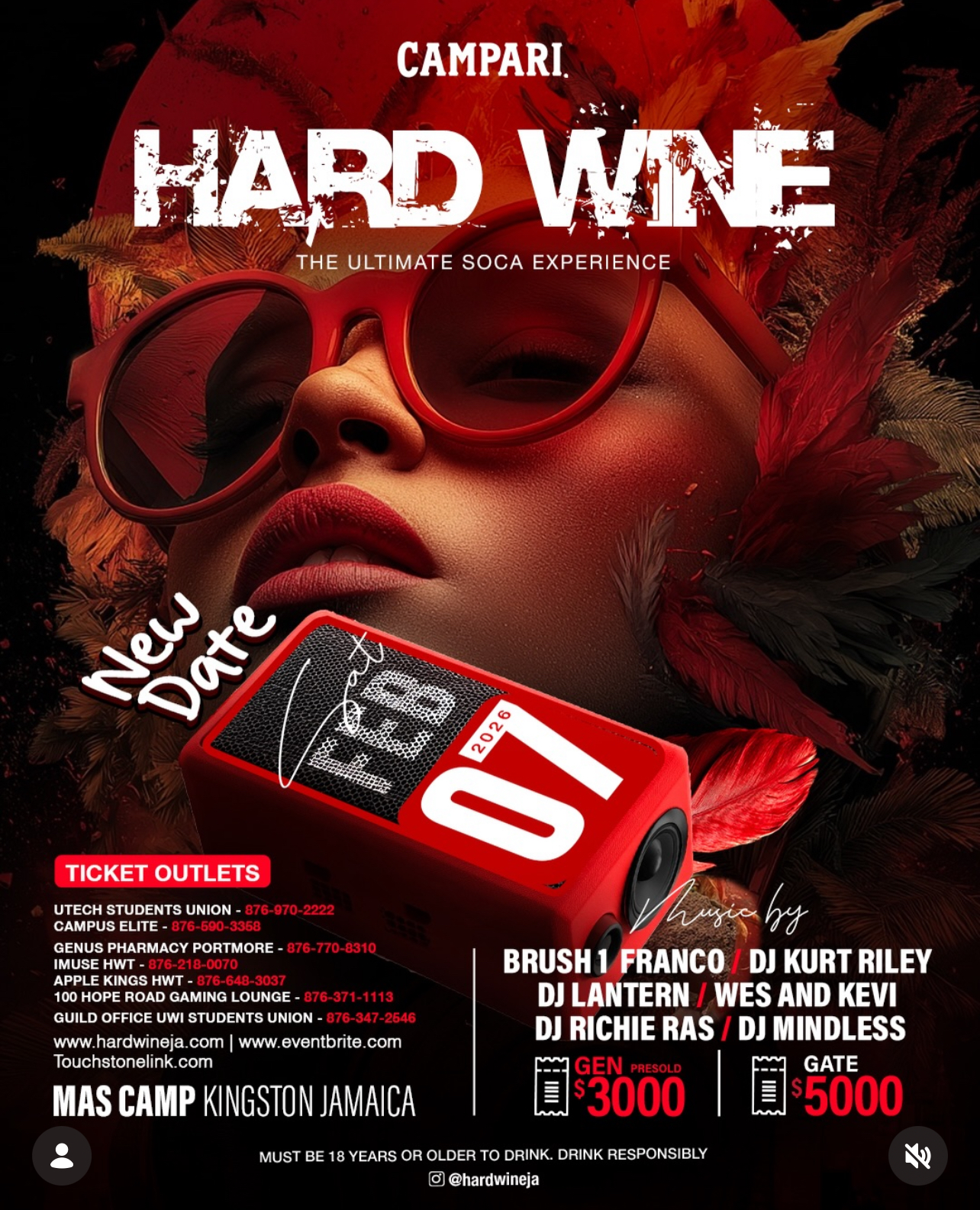 Hard Wine x Campari (Jamaica) February 7, 2026 Kingston Mas Camp Tickets The Mother of All Out-of-Season Soca Fete🎉 HardWine: The Ultimate Soca Experience 🎶 Next Staging: Feb 7,2025
